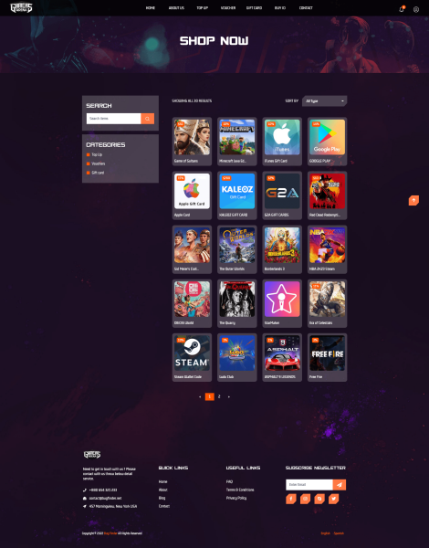 - Loja Digital Online de Jogos, Recargas, Vouchers e Ferramentas de Venda de IDs de Jogadores. Muitos gamers querem comprar recargas de jogos, vouchers e cartões virtuais, mas não possuem cartões internacionais. Eles desejam fazer isso usando sua moeda local. A plataforma ajuda jogadores profissionais a comprar CÓDIGOS DIGITAIS como (Recarga de Jogo, CD-Key, Cartão de Jogo, Cartão de Pagamento, Cartão de Presente VOD, Cartão de Presente de Plataforma de Música, Cartão Pré-pago de Recarga de Celular, Cartão de Presente de Compras), RECARGA DIRETA como (Serviço de Recarga de Jogo, Recarga Direta de Jogo Móvel, Recarga de Aplicativo de Vídeo Sob Demanda, Recarga de Aplicativo de Entretenimento, Recarga de Aplicativo de Streaming Ao Vivo), RECARGA DE CELULAR como (Recarga de Internet Pré-paga Móvel), MERCADO DE BENS DIGITAIS e Plataforma de Venda de IDs de Jogadores.